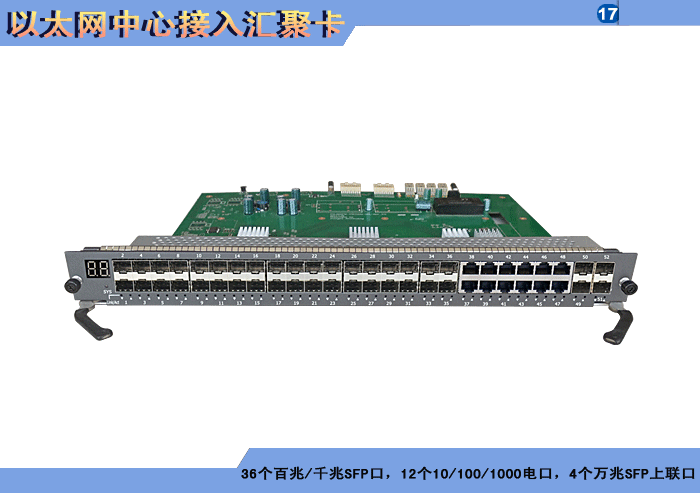 配置 以太網中心接入匯聚卡,36個百兆/千兆 SFP口,12個10/100/1000電口,4個萬兆SFP上聯口,L2/L3層交換,可堆疊,背板供電,19英寸插卡,通用型/工業型。