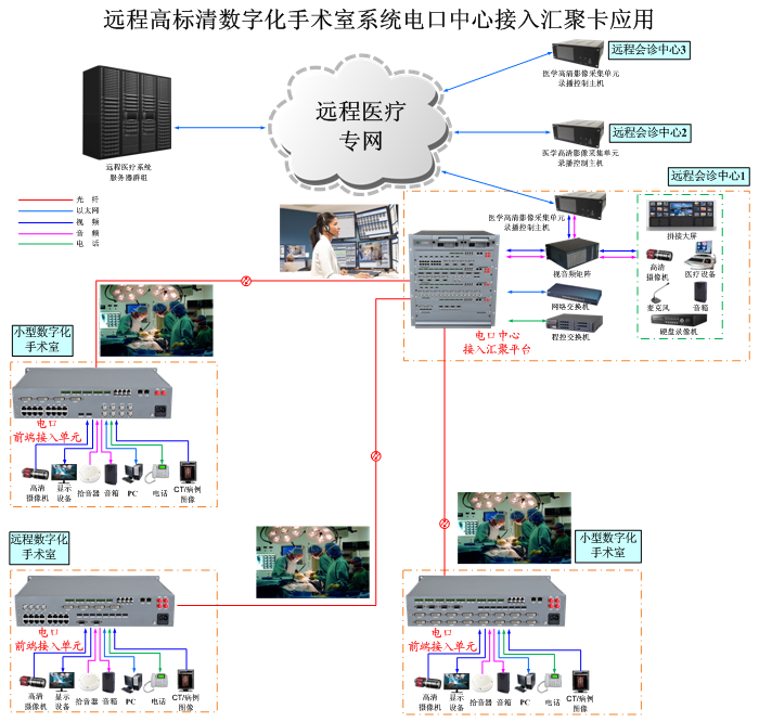 遠程高標清數字化手術室系統電口中心接入匯聚卡,1/2/4/8路HD-VI/DVI/HDMI/DP/VGA/YPbPr/模擬標清視頻/IP網絡攝像機電口輸出,1/2/4/8路DVI/HDMI/DP/VGA/YPbPr/模擬標清視頻/IP網絡顯示屏電口輸入,1/2/4/8路模擬/數字雙向立體聲音頻可選,1/2/4/8路可選數據,多路電話或百兆/千兆以太網可選,單模/多模,獨立/冗余供電,1/2/3/4U機架,非網管/網管/帶光纖數字診斷網管 |
