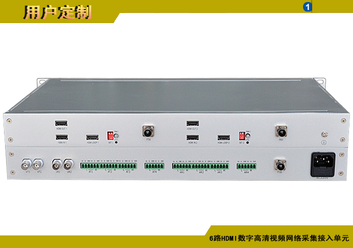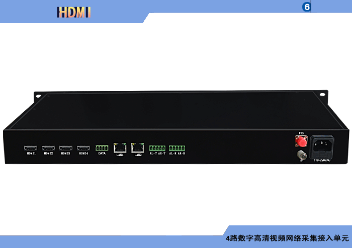 6路HDMI數(shù)字高清視頻網(wǎng)絡(luò)采集接入單元,1光2電百兆/千兆以太網(wǎng)接口,1路雙向音頻/報警開關(guān)量/控制數(shù)據(jù),單模/多模/塑料,1/2纖,ST/FC/SC/LC/SFP光接口,15/20/25/32dB,獨立供電,2U機架,通用型 |