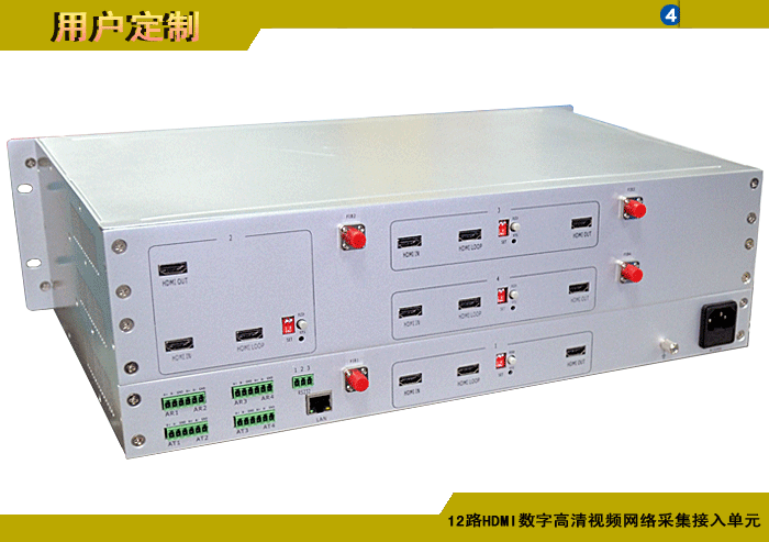 12路HDMI數(shù)字高清視頻網(wǎng)絡(luò)采集接入單元,1光2電百兆/千兆以太網(wǎng)接口,1路雙向音頻/報警開關(guān)量/控制數(shù)據(jù),單模/多模/塑料,1/2纖,ST/FC/SC/LC/SFP光接口,15/20/25/32dB,獨立/冗余供電,3U機架,通用型 |