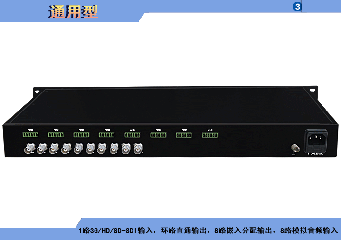 模擬音頻3G/HD/SD-SDI嵌入器,1路3G/HD/SD-SDI輸入,環路直通輸出,8路嵌入分配輸出,8路模擬音頻卡儂/端子/3.5mm/RCA接口輸入,獨立/冗余供電,機架,通用型 |