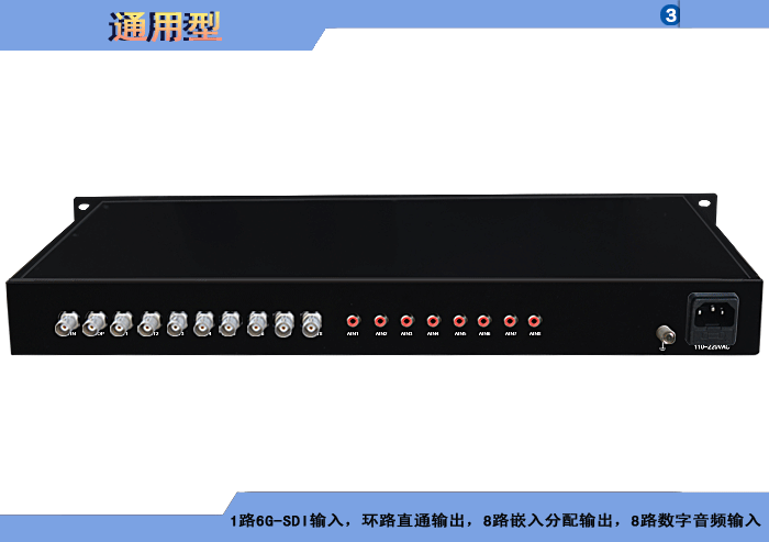 數(shù)字音頻6G-SDI嵌入器,1路6G-SDI輸入,環(huán)路直通輸出,8路嵌入分配輸出,8路數(shù)字音頻卡儂/BNC/RCA/光纖接口輸入,獨(dú)立/冗余供電,機(jī)架,通用型 |