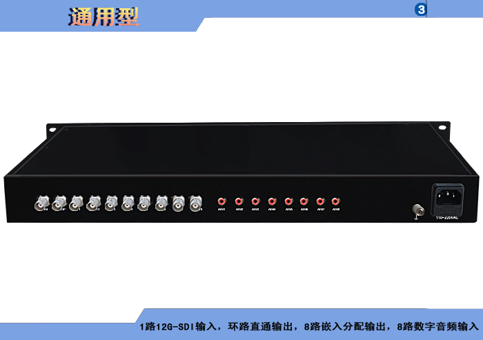 數字音頻12G-SDI嵌入器,1路12G-SDI輸入,環路直通輸出,8路嵌入分配輸出,8路數字音頻卡儂/BNC/RCA/光纖接口輸入,獨立/冗余供電,機架,通用型 |