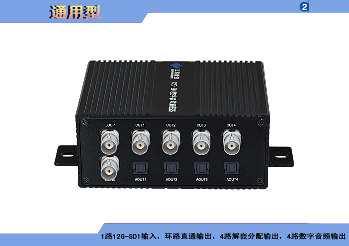 數字音頻12G-SDI解嵌器,1路12G-SDI輸入,環路直通輸出,2路解嵌分配輸出,2路數字音頻卡儂/BNC/RCA/光纖接口輸出,獨立/冗余供電,壁掛,通用型 |