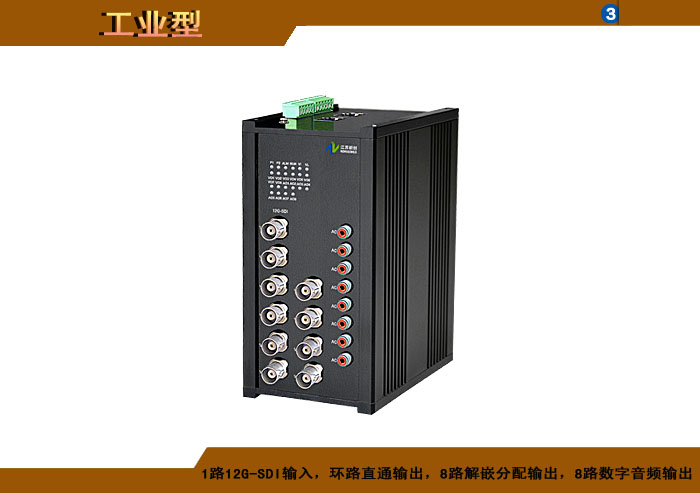 數字音頻12G-SDI解嵌器,1路12G-SDI輸入,環路直通輸出,2/4/8路解嵌分配輸出,2/4/8路數字音頻卡儂/BNC/RCA/光纖接口輸出,獨立/冗余供電,壁掛/機架,防水型 |