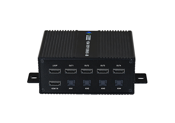 數字音頻4K HDMI嵌入器,1路4K HDMI輸入,環路直通輸出,4路嵌入分配輸出,4路數字音頻卡儂/BNC/RCA/光纖接口輸入,獨立/冗余供電,壁掛,通用型 |