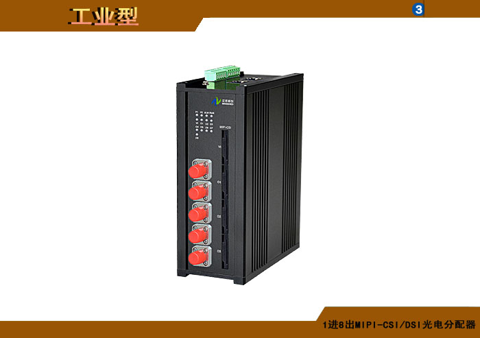 1進8出MIPI-CSI/DSI光電分配器,內置數字均衡器/抖動去除器可選,獨立/冗余/總線供電(DC18~36V/5V),導軌,工業型 |