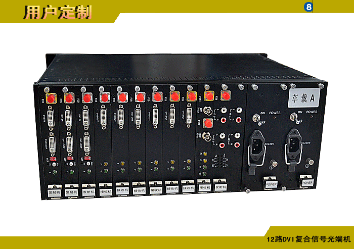 12路DVI復合信號型光端機發射機/接收機,復合信號可選,單模/多模/塑料,1/2纖,ST/FC/SC/LC/SFP光接口,15/20/25/32dB,獨立/冗余供電,機架,通用型 |