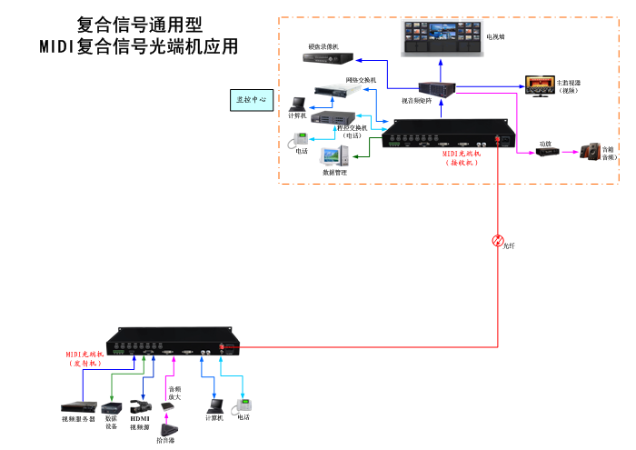 MIDI復合信號光端機已經廣泛應用在在錄音編輯棚、音樂制作和創作中心、AV娛樂中心、立體聲廣播及音樂電臺、大型公共場合廣播播出和分配系統、高檔影音系統、家庭影院、大型舞臺展示和直播系統、大型多媒體高清顯示和信息發布和新聞中心、體育運動賽場、電視直播、多功能多媒體會議系統、酒店、智能樓宇及風景區背景音樂播出和廣播系統、醫學影像處理、自動化控制中心及多媒體教學系統等領域。