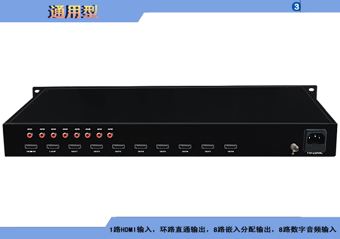 數字音頻HDMI嵌入器,1路HDMI輸入,環路直通輸出,8路嵌入分配輸出,8路數字音頻卡儂/BNC/RCA/光纖接口輸入,獨立/冗余供電,機架,通用型 |