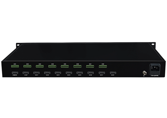 模擬音頻HDMI嵌入器,1路HDMI輸入,環路直通輸出,8路嵌入分配輸出,8路模擬音頻卡儂/端子/3.5mm/RCA接口輸入,獨立/冗余供電,壁掛,通用型 |