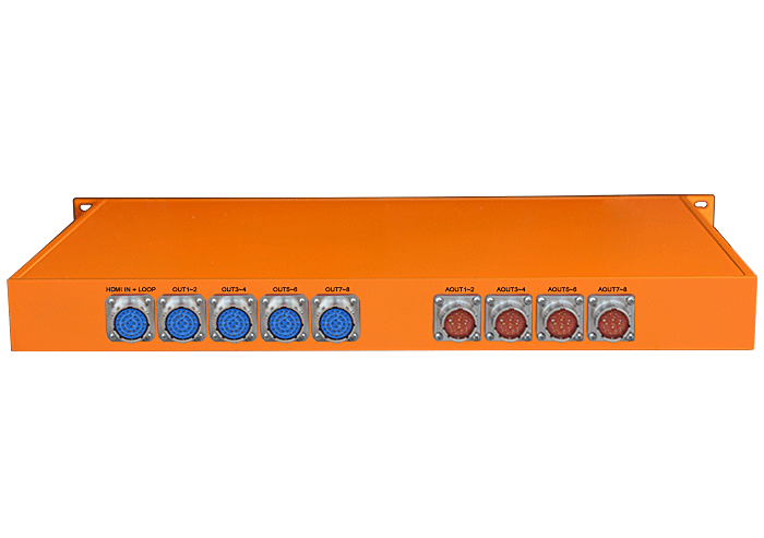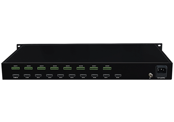 模擬音頻HDMI解嵌器,1路HDMI輸入,環路直通輸出,8路解嵌分配輸出,8路模擬音頻卡儂/端子/3.5mm/RCA接口輸出,獨立/冗余供電,機架,通用型 |