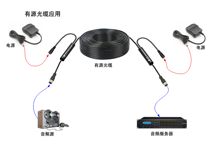 數字音頻有源光纜AOC/光纖導線支持5V、12V(9~18V) 、24V(18~36V)、48V(36~72V)直流電源輸入設計,也可通過有源光纜中電纜混合的方式遠距離供電。