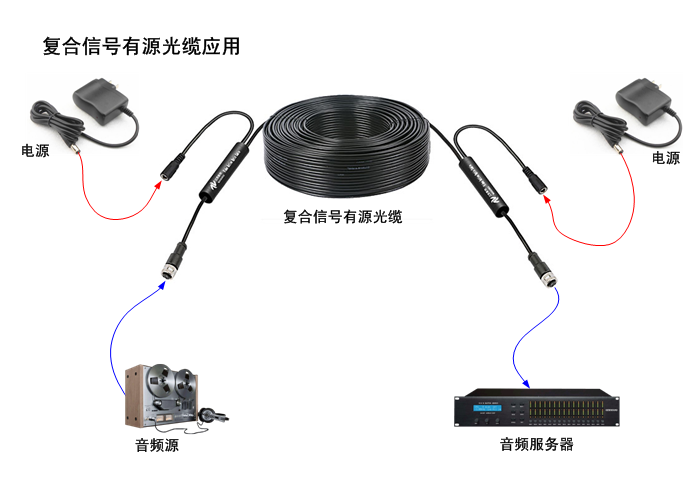 MIDI復合信號有源光纜AOC支持5V、12V(9~18V) 、24V(18~36V)、48V(36~72V)直流電源輸入設計,也可通過有源光纜中電纜混合的方式遠距離供電。