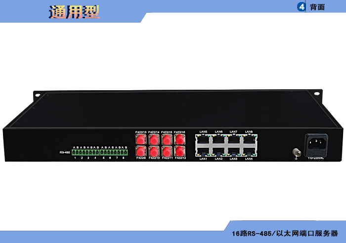 16路RS-485/以太網光電端口服務器,可選多路10/100M或10/100/1000M以太網和RS-485電纜或光纖接口,可選內置數字隔離器,最大隔離電壓2500/5000Vrms,可選內置5/10KA浪涌保護器,獨立/冗余供電,機架,通用型 |