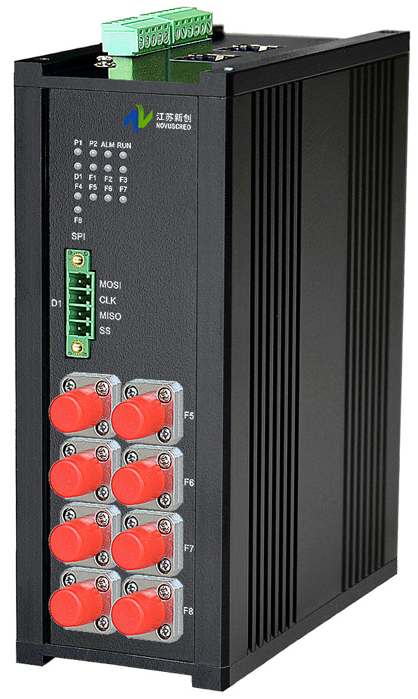 SPI光纖集線器(HUB) 是江蘇新創自主研發創新,專門為工業自動化控制系統、PLC/DCS系統、信號測量及數據采集系統的現場各種IO設備、儀器儀表、電壓、電流、電量、溫度、壓力、流量、液位、電位、位置、煙霧、化學元素檢測等等各種傳感器、變送器、編碼器、計數器、變頻器、伺服器、執行器、RFID讀寫終端、模數轉換設備、探測器、煙感探頭、儀器儀表及測量計量設備、IO控制終端、打印機、模擬A/D或D/A轉換器、DSP芯片、FPGA、微處理器、單片機以及其他各種ASIC芯片輸出的標準SPI總線信號同時分配或擴展成多路SPI光纖輸出,這樣大大方便了多個用戶同時共享同一總線。SPI接口透明支持任意SPI上層協議,支持DC~100K/400K/5Mbps讀寫速率。支持輸入、輸出及電源三端隔離,采用先進的高速數字隔離技術,其傳輸速度和熱穩定性遠高于普通的光電隔離器;內置15KV靜電保護器,可有效防止設備之間由于地不平衡引起的串口損壞及靜電擊穿。內置的高性能的兩級粗細抗雷擊保護裝置,支持共模和差模兩種保護模式。高達10KA通流量的第一級粗保護電路能夠有效的降低和抑制雷電、浪涌大信號沖擊;第二級精細保護電路能夠有效去除小信號殘留電壓沖擊及干擾信號。所有保護電路都采用高可靠、低殘壓、低寄生電容及快速響應保護時間的防雷器件。