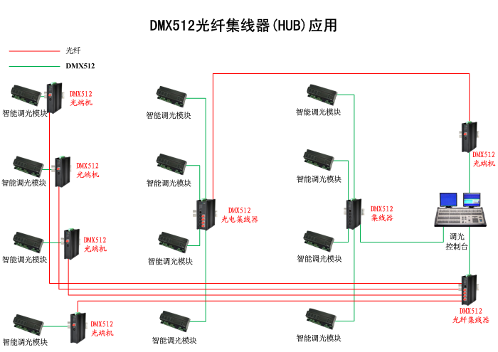 DMX512光纖集線器(HUB)已經廣泛應用在舞臺、劇場、音樂廳等場所的智能燈光控制系統中。
