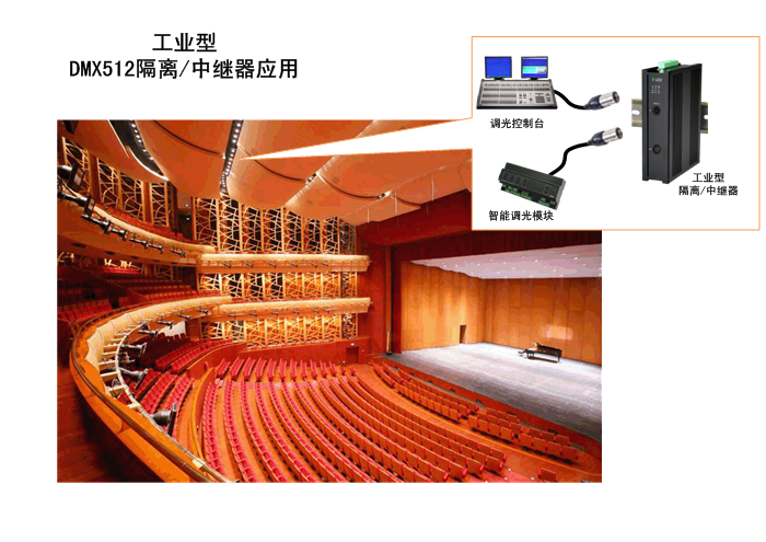 DMX512隔離器(中繼器)已經廣泛應用在舞臺、劇場、音樂廳等場所的智能燈光控制系統中。