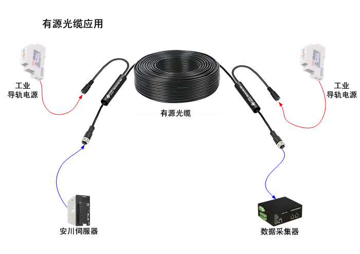Memobus有源光纜AOC/光纖導線支持5V或24V(18~36V)直流電源輸入設(shè)計,也可通過有源光纜中電纜混合的方式遠距離供電。