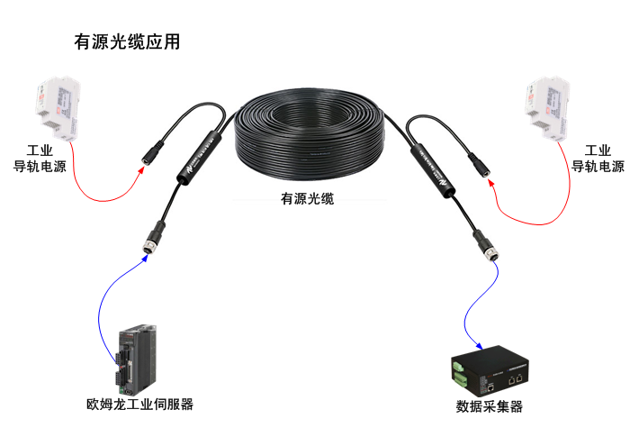 Remote I/O有源光纜AOC/光纖導線支持5V或24V(18~36V)直流電源輸入設計,也可通過有源光纜中電纜混合的方式遠距離供電。