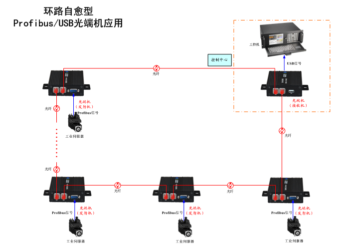Profibus/USB環路自愈型光端機是江蘇新創自主研發創新,專門為各種設備的Profibus接口和計算機主機USB端口在單模、多模或塑料光纖上遠距離、高可靠環路冗余備份通信而設計。采用總線級聯技術將沿光纖線路分布的各節點的Profibus設備共用1芯光纖環路串接在一起與中心主機互聯互通,大大節省了用戶設備投資成本,提高了光纜利用率。采用新創光纖故障智能檢測和報警技術,當環路上某一節點或兩個節點之間的光纖發生故障或斷電時,光纖環路自動進入保護倒置模式,故障節點或故障光纖鏈路自動切除,從而實現了高可靠的冗余備份傳輸;當故障節點或故障光纖鏈路恢復時,光端機立刻自動恢復到正常的工作模式。由于采用高可靠環路自愈保護,因此特別適合在高可靠或環境苛刻的光纖通信系統中使用。